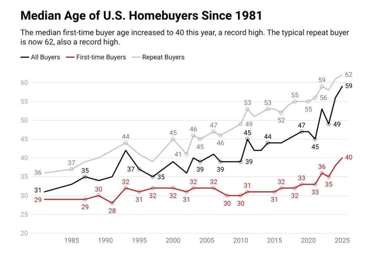 The National Association of Realtors’ 2025 Profile of Home Buyers and Sellers report shows exactly how far things have fallen. First-time homebuyers now make up only 20% of purchases, the lowest share since NAR began tracking data in 1981. Before the Great Financial Crisis, this number was consistently around 40%.