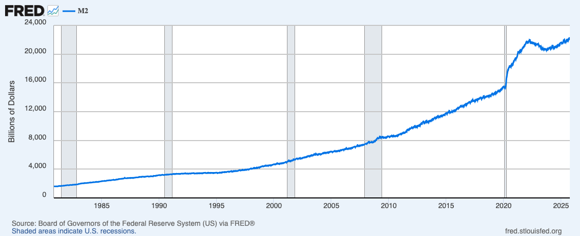 Since the United States abandoned the gold standard in 1971, deficit spending and inflation have far outpaced real wage growth. Each financial crisis has been met with more liquidity and more money creation to bail out the financial system, rather than allowing the excess to be cleared out. The chart below shows the growth of the US money supply.